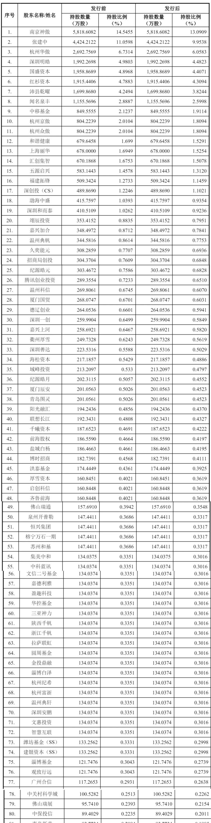 IPO前,南京神傲持股为14.5455%,杭州华傲持股为6.7314%,深圳明皓持股为4.9803%,国盛资本持股为4.8968%,红杉资本持股为4.7883%,沛县乾曜持股为4.2494%,闻名泉丰持股为2.8887%,中移基金持股为2.1237%,杭州京傲、杭州众傲分别持股为2.0104%;
